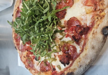 z rzemieślniczym sosem pomidorowym, włoska mozzarella fior di latte, Salami picante, jalapeño, czerwoną cebulą i rukolą